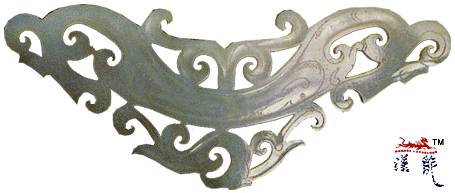 上部镂雕单凤,回首,长冠,长尾。中部镂雕同体双龙,回首相对。下部饰卷草纹。龙、