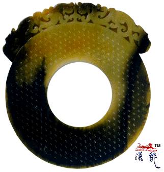 .汉 双螭玉壁,灰白色,间黑褐色,