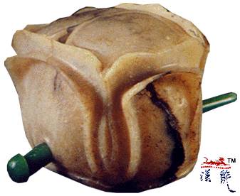 米,有褐斑,簪碧玉。圆雕,冠呈长