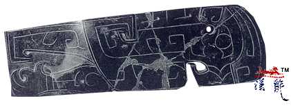 下端微凹,上部左边有一穿孔,可悬挂。1976年河南安阳殷墟5号墓(妇好墓)出土,现藏中国历史博物馆。