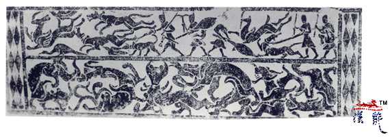 汉 狩猎画像石,高73厘米,宽225厘米,画面减地阳文兼用阴文线刻技法,1973年山东苍山出
