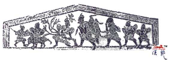 汉 力士画像石,减地阳文与阴文线刻兼用,高41—64厘米,宽225厘米,1956年江苏铜山