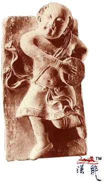 头梳双总髻,上身赤露,
