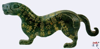 孔。虎作走动形,昂首,尾端卷曲。错金铭文九行,四十字:“兵甲之符,右才