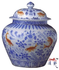 鱼藻纹罐,通体用青花绘鱼藻莲