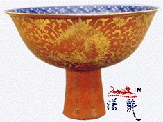 .宣德,攀红地贴金缠枝莲纹高足碗,高10.6厘米,此高足碗先在瓷胎碗心画青花