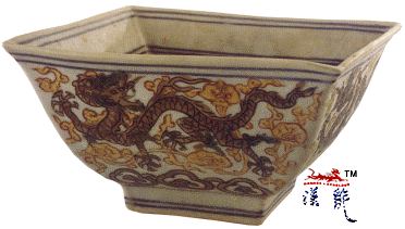 .宣德,三彩灵芝龙纹方碗,高7.1厘米,作升斗状,碗外四侧绘黄、绿、褐三彩,