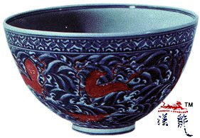 .嘉靖 青花抹红海兽鱼涛纹碗,