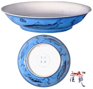 .正德 孔雀绿釉青花鱼藻纹盆,