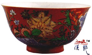 .康熙 珊瑚红地五彩花卉纹碗,