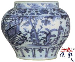 .青花亭園人物罐,高