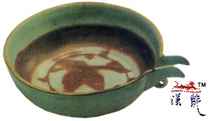 和内上壁施白青釉,内壁下部先刻划水波纹再施红彩,器内中