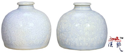 青白磁刻花牡丹唐草文瓶一对,景德镇窑,出光美术馆收藏。