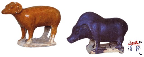 .红釉羊及黑釉猪,羊高14厘米,猪高12厘米,1972年洛阳谷水出土。