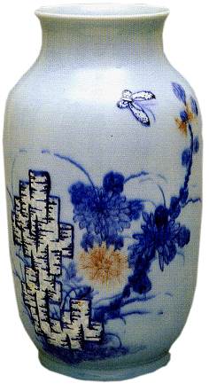 釉为地,器身一侧绘青花枸杞、