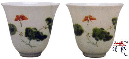 .雍正粉彩花蝶图杯(一对),高7.2厘米,口径6.4厘米,深腹,直圈足,