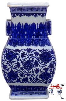 .雍正青花缠枝莲纹贯耳方瓶,
