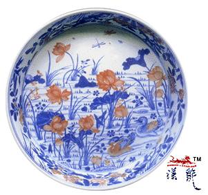 .康熙青花釉里红鸳鸯莲池纹三足洗,