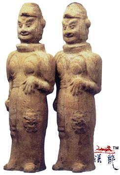 .陶武士俑,此两俑头戴盔,