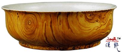 器内施白釉,器外施木纹釉,不露胎底。此器用支钉烧造,木纹清晰逼真,此