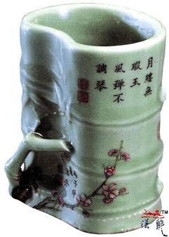 豆青釉加彩笔筒,高
