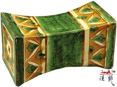 三彩诗文瓷枕,高13.3厘米,长25.5厘米,宽13.5厘米,边沿均为弧线,束腰,