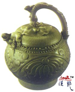 这个青釉倒装壶集捏塑、剔