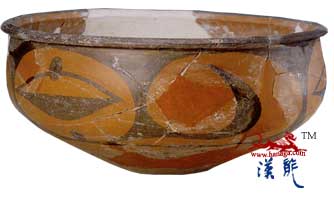 小平底。唇缘涂黑,腹部饰
