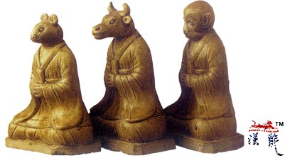 这是十二生肖俑中的3件,均为人身、兽首、着衣、持笏、盘坐,形