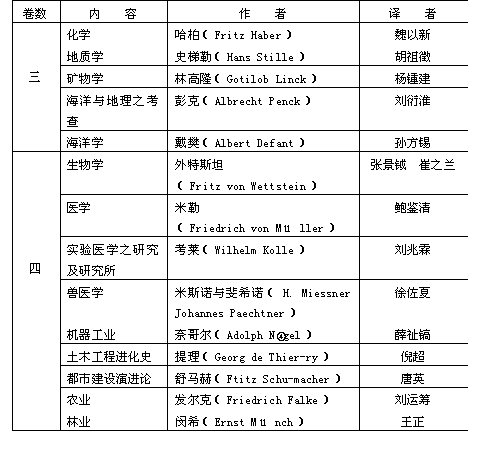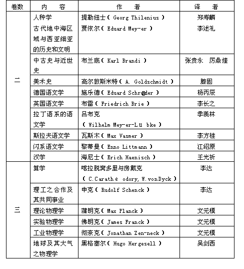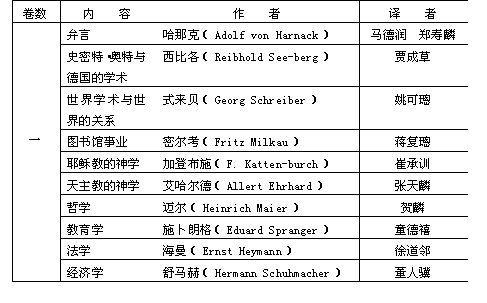 图书资料方面:(一)德文藏书达2871种4450册,德国学术著作的中文译著亦增至1000册,尚有少数其他语种的书籍;③(二)德文杂志增至72种,中文杂志20余种,德国重要报纸数种。其中普鲁士科学研究院的《学术集刊》及哲学、历史类的专刊,自1900年起至1941年止共99册,极有价值;①(三)德文图书分类目录(《Katalog derBücherei des Deutschland-Institutes》)已于1940年出版,中文图书目录也已编制完成。此外尚编有《中文期刊有关德国论文索引》。中德学会的图书馆为当时藏有德文人文科学书籍最完备的图书馆。另外汉学图书室的基础也已奠定。图书馆平日向社会开放。 总务方面:(一)坚持介绍和转赠书籍的工作;坚持咨询工作;坚持学术研究方面的答复和协助工作。建立起同德国主要学术机构的联系,其中关系最密切者是慕尼黑德意志科学院;(二)坚持开办“中德学会德文夜校”。至1937年,夜校由一班增至四班,1938年同慕尼黑德意志科学院合办,德文班扩充到八个班,学生共200余人。1940年夜校的德文名称改称“Sprachkurs der Deutschen Akademie in Rahmen des Deutsch-land-Institutes”(德意志科学院德语夜校中德学会分校),增设研究班一班,供毕业生和德文程度高深者进修;前后编写出版四种德语教材;(三)设立留学奖学金;1938年添设德文成绩优异奖和论文比赛奖,后者范围扩及全国各大学;(四)组织联欢会、茶话会不下30次;举办音乐会、学术报告会多次;(五)介绍德国文化。除放映德国学术性影片外,还举办各种展览,如德国古今木刻绘画展览,古籍展览,德国印刷术发展展览等。中国参观者甚众。 编译方面:编译工作是历届中德学会领导的中心工作,他们知道,译著学术作品,既可保持中德两国珍贵的传统精神,亦是沟通中德两国文化的唯一切实途径。虽历种种困难,翻译工作长此不辍:(一)“中德文化丛书”共出版了26种(包括1937年前出版的6种),尚有10余种在付印中,均为中国学者将德国名著翻译而成;(二)出版中德学会特刊8种,包括张天麟的《德国留学指南》(1937),王锦第译的《今日德国教育》(1938)。特刊均为应付各方面之学术交流需要而出;(三)1939年创编、出版《研究与进步》季刊,1940年更名为《中德学志》,前后6卷22期,很受中国学术界的欢迎;(四)增刊德文的《汉学集刊》(Sinologische Arbeiten),专载中德学会德籍学者所撰之“中国研究”学术文章。此外还翻印了德国汉学家的中国研究著作4—5种。 编译工作在中德文化交流中所起的作用和影响不可低估。《中德学志》创刊号刊登有德国科学情报中心主任、德国的《研究与进步》(Forschungen und Fortschritte)杂志主编克和夫博士(Dr.Karl Kerkhof)的前言,他说这个刊物是“一种纯科学的定期刊物”,它和中德学会的其他刊物一样,“负有沟通中德两国文化之使命,都完全一样地要在中国的学术界略作一点贡献的。”②情况也确如克和夫博士所言,译著对中国学术界和中国社会发生深远的影响。下面仅举例说明之: 其一,中德学会编译的中德文化丛书之六,为《五十年来的德国学术》,共四卷,1937年3月由商务印书馆出版。此书把当时德国最高水平的人文科学和自然科学的研究成果,系统地介绍给中国学术界和中国社会,影响大而深远。这些研究成果的译者,大半都是著名的留德学者。下面是该著作的内容提示: