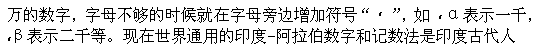 筹算一出现,就严格遵循十进位值制记数法。九以上的数就进一位,同一个数字放在百位就是几百,放在万位就是几万。这种记数法,除所用的数字和现今通用的印度-阿拉伯数字形式不同外,和现在的记数法实质是一样的。筹算是把算筹一面摆成数字,一面进行计算,它的运算程序和现今珠算的运算程序基本相似。记述筹算记数法和运算法则的著作有《孙子算经》(公元四世纪)、《夏侯阳算经》(公元五世纪)和《数术记遗》(公元六世纪)。负数出现后,算筹分成红黑两种,红筹表示正数,黑筹表示负数。算筹还可以表示各种代数式,进行各种代数运算,方法和现今的分离系数法相似。我国古代在数字计算和代数学方面取得的辉煌成就,和筹算有密切的关系。例如祖冲之的圆周率准确到小数第六位,需要计算正一万二千二百八十八边形的边长,把一个九位数进行二十二次开平方(加、减、乘、除步骤除外),如果没有十进位值制的计算方法,那就会困难得多了。 古巴比仑的记数法虽然有位值制的意义,但是它是六十进的,计算比较繁琐。古埃及的数字从一到十只有两个数字符号,从一百到一千万有四个数字符号,而且是象形的,例如用一个鸟表示十万。文化比较发达的古希腊,由于看重几何,轻视计算,记数方法十分落后,用全部希腊字母表示一到一