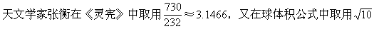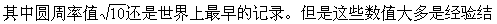 在解决求圆周长、圆面积、球体积等类问题的时候,经常要用到圆周率π。圆周率π可以表示成无限不循环小数 3.1415926535……。 近代数学已经证明,圆周率π是一个不能用有限次加减乘除和开各次方等代数运算求出来的数,就是所谓“超越数”。 中国在两汉之前,一般采用的圆周率是“周三径一”,也就是π=3。很明显,这个数值非常粗糙,用它进行计算会造成很大的误差。随着生产和科学的发展,“周三径一”就越来越不能满足精确计算的要求。因此,人们开始探索比较精确的圆周率。例如,据公元一世纪初制造的律嘉量斛(一种圆柱形标准量器)推算,它所取的圆周率是3.1547。公元二世纪初,东汉