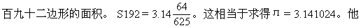 接正三千零七十二边形的面积,验证了前面的结果,并且得出更精确的圆周率值