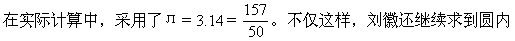 果,缺乏坚实的理论基础。因此,研究计算圆周率的科学方法仍然是十分重要的工作。 魏晋之际的杰出数学家刘徽,在计算圆周率方面,作出了非常突出的贡献。他在为古代数学名著《九章算术》作注的时候,正确地指出,“周三径一”不是圆周率值,实际上是圆内接正六边形周长和直径的比值。用古法计算圆面积的结果,不是圆面积,而是圆内接正十二边形面积。经过深入研究,刘徽发现圆内接正多边形边数无限增加的时候,多边形周长无限逼近圆周长,从而创立割圆术,为计算圆周率和圆面积建立起相当严密的理论和完善的算法。 刘徽割圆术的主要内容和根据是: 第一,圆内接正六边形每边的长等于半径。