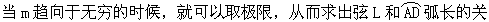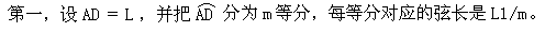第二,当m=2时,明安图继承和发展了中国古代传统数学的割圆术,根据相似三角形对应边成比例,逐步推算(如图),把AD=L表示为L1/2的一个幂级数。 第三,当m=5时,明安图吸取和推广了外国有关的数学知识,把L表示为L1/5的一个多项式。 第四,利用第二、三两步分别把L表达为L1/2、L1/5的公式,然后相互代入,逐步推导,顺次求出把L表达为L1/10、L1/100、L1/1000、……关系式的系数。显然,如果把弧分成10000等分,这时的弦和弧的长度已经相当接近了。