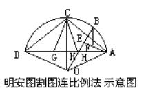 系式。 明安图割圆连比例的中心思想是根据相似三角形对应边成比例的道理,得出一连串比例关系式,求出适当的折线长度,然后用折线逼近圆弧,从折线和弦的关系导出弧和弦的关系。 明安图采用这种中西结合、融会贯通、用割圆连比例把它们统一起来的方法,成功地证明了前面提到的公式,从而把三角函数和圆周率的研究提高到一个新的水平,这是明安图的重大贡献。不仅这样,明安图对于直曲关系转化的认识也有了新的提高。在古代割圆术中,对于直曲关系转化的认识表现在用圆内接正多边形逼近圆周。而明安图指出:弓形中的弧是曲线,弦是直线。曲线和直线总有区别,不能等同。但是弧和弦的关系不是无法解决的。当我们把某段弧长等分得十分细,以至于无穷,就可以把弧和弦统一起来,而得出彼此相求的关系。这样,他的认识就超出了圆内接正多边形的范围,也超出了仅仅是求圆周长的范围,开始讨论任意长度弦和它所对弧之间的相互关系。这种对弦弧、直曲关系的辩证认识,为明安图解决展开三角函数问题提供了正确的思维途径。