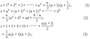 沈括怎样得到这个公式,没有说明,大概是先用具体数字进行试验,然后用归纳的方法得到的。 南宋理宗景定二年(公元1261年),杨辉在《详解九章算法》中继续对这个问题进行研究,他得到三个高阶等差级数公式:
