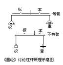 杠杆在中国的典型发展是秤的发明和它的广泛应用。在一根杠杆上安装吊绳作为支点,一端挂上重物,另一端挂上砝码或秤锤,就可以称量物体的重量。古代人称它“权衡”或“衡器”。“权”就是砝码或秤锤,“衡”是指秤杆。迄今为止,考古发掘的最早的秤是在长沙附近左家公山上战国时期楚墓中的天平。它是公元前四到三世纪的制品,是个等臂秤。不等臂秤可能早在春秋时期就已经使用了。古代中国人还发明了有两个支点的秤,俗称铢秤。使用这种秤,变动支点而不需要换秤杆就可以称量比较重的物体。这是中国人在衡器上的重大发明之一,也表明中国人在实践中完全掌握了阿基米德杠杆原理。 《墨经》一书最早记述了秤的杠杆原理。《墨经》是战国时期以鲁国人墨翟(约前468-前376)为首的墨家著作。墨翟和他的弟子们以刻苦耐劳、参加生产、勇敢善战著称。因此,他们的著作中留下了许多自然科学知识。 《墨经》把秤的支点到重物一端的距离称作“本”(今天通常称“重臂”),把支点到权一端的距离称作“标”(今天称“力臂”)。《墨经·经下》中说:第一,当重物和权相等而衡器平衡时,如果加重物在衡器的一端,重物端必定下垂;第二,如果因为加上重物而衡器平衡,那是本短标长的缘故;第三,如果在本短标长的衡器两端加上重量相等的物体,那么标端必下垂。(“衡,加重于其一旁,必垂。权、重相若也相衡,则本短标长;两加焉,重相若,则标必下。”)墨家在这里把杠杆平衡的各种情形都讨论了。他们既考虑了“本”和“标”相等的平衡,也考虑了“本”和“标”不相等的平衡;既注意到杠杆两端的力,也注意到力和作用点之间的距离大小。虽然他们没有给我们留下定量的数字关系,但这些文字记述肯定是墨家亲身实验的结果,它比阿基米德发现杠杆原理要早约二百年。