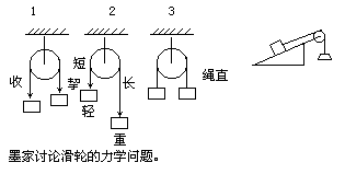 滑轮的另一种形式是辘轳。把一根短圆木固定于井旁木架上,圆木上缠绕绳索,索的一端固定在圆木上,另一端悬吊水桶,转动圆木就可提水。只要绳子缠绕得当,绳索两端都可悬吊木桶,一桶提水上升,另一桶往下降落,这就可以使辘轳总是在作功。辘轳大概起源于商末周初(公元前十一世纪)。据宋代曾公亮(998-1078)著《武经总要前集》卷十一《水攻·济水府》,周武王时有人以辘轳架索桥穿越沟堑的记载。唐代刘禹锡(772-842)描写了他亲自所见的一种叫“机汲”的提水机械,它是把辘轳和架空索道联合并用,以便把山下流水一桶桶地提上山顶,既浇田地又省力(《刘梦得文集》卷二十七《机汲记》)。 最早讨论滑轮力学的还是《墨经》。《墨经·经下》把向上提举重物的力称作“挈”(qí),把自由往下降落称作“收”,把整个滑轮机械称作“绳制”。《墨经》中说:以“绳制”举重,“挈”的力和“收”的力方向相反,但同时作用在一个共同点上。提挈重物要用力,“收”不费力,若用“绳制”提举重物,人们就可省力而轻松。(“挈与收反。”“挈,有力也;引,无力也。不必所挈之止于施也,绳制之也。”)又说:在“绳制”一边,绳比较长,物比较重,物体就越来越往下降;在另一边,绳比较短,物比较轻,物体就越来越被提举向上。(“挈,长重者下,短轻者上。”)又说:如果绳子垂直,绳两端的重物相等,“绳制”就平衡不动。(“绳下直,权重相若则正矣。”)如果这时“绳制”不平衡,那么所提举的物体一定是在斜面上,而不是自由悬吊在空中。我们对于墨家的丰富的力学知识就不能不赞佩!