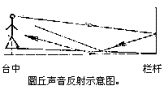 回音壁南面有一座由青石砌成的圆形平台,叫“圜丘”,它最高层离地面约五米,半径约一一·五米。除东西南北四个出入口外,周边都围有青石栏杆。整个圜丘包括地面都是由反射性能良好的青石和大理石砌成的。平台并不平,而是从圆心向周边稍有倾斜的台面。它的声学奥妙就在这里。当人站在台中心叫一声,他自己听到的声音比平常的声音响,而且似乎是从他脚底石板下传上来的。这是由于声波被青石栏杆反射到稍有倾斜的台面,再从台面反射到人耳的缘故(如右图)。 莺莺塔就是普救寺舍利塔。因古典文学名著《西厢记》中张生和莺莺的故事发生在普救寺,所以人称莺莺塔。塔初建于唐武则天时期(公元684年到704年间),是七层的中空方形砖塔。后毁于明嘉靖三十四年(公元1555年)大地震。震后八年按原貌修复,并把塔高增到十三层五十米。这塔最明显的声学效应是,在距塔身十米内击石拍掌,三十米外会听到蛙鸣声;在距塔身十五米左右击石拍掌,却听到蛙声从塔底传出;距塔二·五公里村庄的锣鼓声、歌声,在塔下都能听见;远处村民的说话声,也会被塔聚焦放大。诸如此类奇特的声学效应,原来是由于塔身的形体造成的:塔体中空,具有谐振腔作用,可以把外来声音放大。塔身外部每一层都有宽大的倒层式塔檐,可以把声音反射回地面,相距稍有差别的十三层塔檐的反射声音会聚于三十米外的人的耳朵而形成蛙鸣的感觉①。