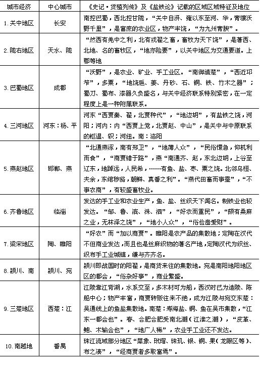 最密集的地区,其次是黄河流域和长江流域。 2.早期城市经济区的出现 秦、汉时期,随着上述全国性城市网的形成,相应地出现了依托于已兴盛起来的“四方辐辏,并至而会”的城市,对其腹地的经济起着沟通联系的作用。各大城市之间由大道或沟渠相通,农业、手工业、畜牧业等开发各有特色,矿产、海产、山林等资源利用各具所长的局面。大体上形成了“农、工、商、贾、畜长,固求富益货也”①的十大早期城市经济区域(表4-3)。 但值得指出的是,这一时期全国虽然出现了以大、中城市为中心的十大经济区,但它们仍然是建立在自然分工、自然经济基础上的。秦始皇作为新兴地主阶级的代表,他为了扶植个体小农和新兴地主阶级,对民间小工商业者进行抑制,于始皇二十八年提出了重本抑末的主张,“皇帝之功,勤劳本事,上农重末,黔首是富”②,采取了迁“七科谪”于岭南,盐铁官营,平准、均输,以及收回铸币权等一系列措施。实质上,这样一方面把主要财源掌握在朝廷手中,割断了富商大贾与地方郡国王侯的经济联系,削弱了地方割据势力的物质基础;另一方面,又使城镇体系内各城镇间横向联系进一步减弱,反衬出以行政手段为主纵向联系,形成了一种由基层城市向核心城市集聚的向心封闭态势。其后到东汉时期,封建地主庄园经济又在各地普遍形成。在这种经济形势下,尽管社会经济仍在发展,但地区间经济联系反而日益萎缩了。正是由于上述两方面的因素,自然经济特点突出,对城市商业的发展、城市间的联系,必然表现为既有联系却又不十分密切,既有发展又有局限的特点,这一时期城镇体系整体上必然表现为相对封闭的特征。 表4-3 秦汉时期的城市经济区域