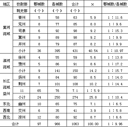 据记载,秦代主要是从黄河中、下游向北部边疆及南方山区移民。始皇33年(公元前214年),“西北斥逐匈奴,自榆中并河以东,属之阴山,以为四十四县,城河上为塞,又使蒙恬渡河取高阙、阳山,北假中,筑亭障以逐戍人。徙谪实之初县”。同年,“发诸尝逋亡人,赘婿、贾人,略取陆梁地,为桂林、象郡、南海,以适遣戍”①。“使与越杂处”②。至汉初仍继续向西北边疆移民,武帝元朔2年(公元前127年),“收河南地,置朔方、五原郡”;元狩4年(公元前119年)“乃徙贫民于关以西,及充朔方以南新秦中”③;大致与此同时,又“置张掖、酒泉郡、而上郡、朔方、西河、河西开田官,斥塞卒六十万人田之”④;并沿“丝绸之路”在乌垒(今新疆轮台东)置使者校尉,在轮台(今新疆轮台东南)、渠犁(今库尔勒)、赤谷(今伊塞克湖南)、伊循(今若羌)、莎车等地驻兵屯田⑤。但到西汉末年,尤其是新莽期间,黄河中、下游地区生产力遭到极大破坏,灾民大批外迁,据史书记载,其时“流民入关者数十万人”⑥,“避乱江南者,皆未还中土,会稽颇称多士”⑦,其分布尤以湖南、江西、浙江、江苏为最多⑧。使我国人口分布与先秦相比,发生了明显的变化。随着郡县的进一步推行,城市分布范围进一步扩大,至东汉时全国城市网基本形成。 根据《中国历史地图集》第二册的资料,至东汉永和年间,全国13校尉部、刺史部均已建立了郡——县二级城市网。从城市分布的地域空间结构看(表4-2),主要集中在黄河中、下游地区(包括今河南、河北、山东、山西和陕西五省区),其城市数约占全国城市总数的2/5;其次为淮河流域(约占14%);而东南沿海分布最少。再以郡、县城比看,由于我国秦、汉时期是郡县制全面推行的初期,一般地说,经济开发水平愈高,县城建制愈多,城市分布愈密,郡县城比也就愈小。从表4-2也可看出,东汉时我国淮河流域经济水平最高,其比数为1∶15.7,尤其豫州刺史部达1∶ 17.2,是我国城市分布 表4-2东汉时期城市地域分布表
