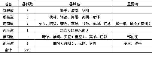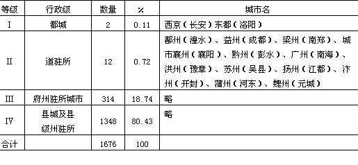 说明:(1)本表含渤海、南诏等国城市。 (2)府、州、县建制以公元741年(开元二十九年)为准。 (3)安西、北庭都护府以公元658~702年(显庆三年至长安二年)间建制为准;安北、单于两都护府以公元647~669年(贞观二十一年~总章二年)间建制为准。 (4)吐蕃所属千户所按县城统计;回纥以公元759年(唐肃宗乾元二年)为准;渤海以公元820年政区为准;南诏以公元879年政区为准。