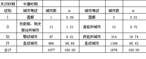 并称八大都市。 (2)地域经济开发,地区中心城市增加。从全国城市等级规模结构看,这一时期与秦、汉时期相比,有了很大的变化。仅就各级城市的数量而言,国都及大区中心城市数量没有变化,但作为高于县城以上一级城市的府、州城市,却比秦、汉时期郡级城市数量有了较大的增加,由原来的97个上升为314个,所占全国城市总数的比重增加了一倍以上(表4-7),可见地区中心城市有了明显的增加。 表4-7东汉至中唐时期城市等级规模结构变化表