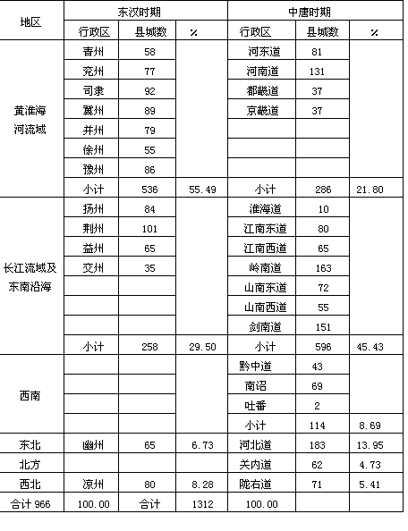 说明:(1)由于行政区变动较大,其比较仅为相对数。 (2)西南地区包括了剑南道的一部分,未划出。 (3)剑南道包括姚州16州级县城、戎州8州级县城。 (4)黔中道包括黔州所领16州级县城。 (5)岭南道包括桂州所领6州级县城、邕州所领11州级县城、安南所领5州级县城。 资料来源:《中国历史地图集》。