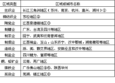 明、清时期城镇职能组合结构的变化,主要是按地域组织的不同类型的城镇职能组合结构开始出现。这一时期农业经济较前期又有了较大的发展,由于蚕桑、棉花、茶叶等为主的经济作物大面积种植,并在此基础上发展了一系列纺织、印染、制茶等手工业、商业城市和市镇,形成了一定地域范围内具有城乡密切联系特征的地域经济结构,从而出现了我国早期以地域劳动分工为基础的地域城镇体系的职能组合结构。 1.农产品专业化地区出现 据资料表明,明、清两代,我国农业除了种植以自给性为主的稻谷等粮食作物外,还出现了两种形式的农产品商品化生产。其一为以粮食生产为主、经济作物为辅的农产品商品化生产;其二为以经济作物生产为主的专业化生产。这两种生产类型初步形成了我国早期的农产品专业化地区。概括起来主要有: (1)棉区。我国的棉花种植,弘治年间(公元1488~1505年)即已“遍布天下,地无南北皆宜之,人无贫富皆赖之,其利视丝枲盖百倍焉”①。至明万历年间(16世纪末~17世纪初),江南沿海的松江、上海、嘉定、太仓是我国当时棉花最集中的产区;此外山东、山西、河南、陕西、湖广、四川、江西及南北直隶等也发展了棉业②。据记载,当时松江、上海的200万亩耕地已“大半种棉”;太仓、嘉定等地也三分种稻、七分种棉,“其民独托命于棉”③;即使山东,植棉地区“六府皆有之,东昌(聊城地区)尤多,商人贸于四方,民获以利”④;河南,万历时“中州沃土,半植木棉”①;甚至福建万历年间也有“夫庸半亩园,种植换新谷”的记载②。 (2)桑蚕区。桑蚕生产在我国有悠久的历史,至明、清时期得到了进一步的发展,其中以江南地区最为发达,尤其以太湖流域的桑蚕生产已渐趋集约化,如杭州已形成为我国当时重要的丝织中心。据记载,当时全国“蚕桑之利,莫甚于湖”③,嘉兴“蚕桑织绣之技,衣食海内”④。甚至在湖州、桐乡一带,桑叶也作为重要商品生产,“大约良地一亩,可得桑八十箇(每箇20斤),计其一岁垦鉏壅培之费,大约不过二两,而其利倍之”⑤。可见当时桑叶不仅作为商品,而且收获量大,获利也高。 (3)茶区。茶叶生产是我国早期首先发展的商品性农业部门,这一时期与隋、唐、宋、元时相比,虽种植面积与生产数量有所减弱,但仍占有重要的地位。据记载,其时茶区主要分布于长江、闽江、珠江等流域,尤其安徽沿江的丘陵地区与湖北坼州、鄂州、归州等地最为著名。 (4)甘蔗区。我国甘蔗种植主要是在这一时期开始的。其种植范围主要分布于闽、浙、赣、两广和四川等地。据记载,明万历十五年(公元1587年)福建泽南一带甘蔗种植满山遍野⑥;广东番禺、东莞、增城、阳春等县更有“连岗接阜,一望若芦苇”⑦。可见当时甘蔗生产之盛。 此外,蓝靛和红花等染料作物随着纺织业的发展开始种植;烟草也于明万历年间在闽广一带零星种植,等等。 随着上述经济作物地区专业化生产的发展,不仅进一步促进了手工业的分工和以加工为主的手工业的发展,而且在这一基础上,通过城乡间密切的经济联系和生产协作,初步形成了若干个各具特色的城乡结合的生产形式。 这种城乡结合的形式,不仅将城市及其周围农村地区的生产有机地结合起来,而且依据地域范围内的资源优势、地区优势,组织分工协作的专门化生产。表现为具有三个方面的明显变化:第一,某些重要的农产品加工发展成独立的手工业部门。主要有丝织、酿酒、制糖、碾米乃至与耕作结合最紧密的家庭棉纺织业。第二,封建手工作坊向资本主义手工工场转化。明中叶以后,由于手工业生产力和技术逐步提高,在丝织业部门首先出现手工作坊;嗣后通过广大商品生产者不断竞争分化,由最初财产上量的差异,导致了这种作坊的性质变化。如杭州、苏州的丝织业,嘉兴石门的榨油业,江西浮梁的陶瓷业,铅山石塘的造纸业,芜湖等地的印染业,广东佛山的冶铸业等,都先后出现了资本主义性质的作坊和手工工场。第三,传统耕织结合的自然经济相应演化为三种亚型。随着社会生产力提高,商品经济的发展,家庭手工业脱离农业的现象逐步扩大,尽管家庭手工业同农业相结合仍在封建经济中占有统治地位,但这种传统的结合形式已演化为三种亚型:其一“耕织结合”型:“夫耕妇织”自给性农业与自给性家庭手工业的结合;其二,“以织助耕”型:自给性农业与商业性手工业的结合;其三,“商业织耕”型:商业性农业与商业性手工业结合。在全国范围内形成了若干以某种产品生产、加工为主的手工业区(表5-4)。 2.不同类型城镇职能组合的形成 在这些手工业区域内,又相应形成了以大中城市为核心,中小市镇为主体,具有不同地域特色的地方城市体系的职能组合结构。根据城镇经济特点,可将这一时期的城市(镇)大体划分为四种不
