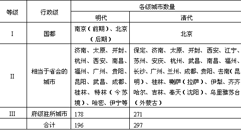 明、清时期,农业商品性生产的发展,促进了城镇经济的繁荣,尤其突出地表现为小城镇的发展。就这一时期城镇体系的等级规模结构而言,正由于小城镇的发展而日趋协调起来。 1.全国行政中心城市网更趋完善 明、清两代由于政治上统一,疆域又有了扩展。随着国土资源的开发,全国行政中心网络更趋于扩展和完善。从行政体系设置看,明、清两代继承了宋、元体制,明设布政使司,清置省(均相当于元代中书省制),下及府、州、县、镇等四级。无论在内地,还是在边远地区,这种政治上的高度中央集权和政令统一的全国行政中心城市网已经基本形成。与之相对应,全国首都——省城——府(州)城——县城——镇五级行政中心城市网也更加完善。明、清两代以行政中心为主的城市等级系列组合如表5-7。 表5-7 明清时期城市等级系列组合状况表