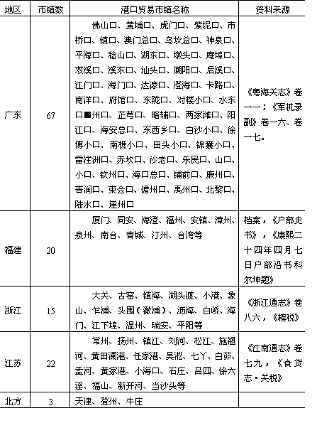 崖,凡方三路,均有出海门户”①;福建、浙江、江苏沿海也是“江海风清,梯航云集,从未有如斯之盛者也”②;山东、河北、辽宁港口的“轻舟”贩运也十分活跃。但到18世纪中叶以后,英商“屡违禁令,潜赴宁波”贸易,为了巩固海防,防患于未然,乾隆二十二年(1757年)便又封闭了宁波等口岸,只许在广州收泊贸易。 这样,明自嘉靖元年(1522年)至隆庆元年(1567年),清初顺治十二年(1655年)至康熙二十二年(1683年),康熙五十六年(1717年)至雍正五年(1727年),以及乾隆二十二年(1757年)至道光二十年(1840年),凡166年的厉行海禁,闭关自守,致使我国海港城市发展停滞不前,有些则由于长期封闭,海港职能丧失殆尽,海港从此一蹶不振,衰落下去。唯居海河入口、海上漕运终点的天津(海津镇)“北近北京,东连海岱,天下粮艘商舶鱼贯而进,殆无虚名”。明末清初时,“虽为卫,实则即一大都会所莫能过也”③;江海之交的上海,也“益繁益茂”,有“小苏州”之称④,清中叶以后一跃而成为长江下游入海口繁荣城市。 (3)地方小港口城镇的发展。明、清两代的对外贸易政策,一直处于“有开有闭,禁中有放,开中有禁”的不稳定状态之中,但由于这一时期商品性农业、手工业的发展,对外贸易的欲望都比宋、元时期变得更加强烈了。从而促进了沿海地方港口市镇的发展。 自明中叶至清前期,尽管我国官方贸易有所衰落,但民间海上贸易兴起,“市舶”繁于“贡舶”成为这一时期对外贸易的主要特征。与此同时,西方早期殖民主义者葡萄牙、西班牙、荷兰相继东来,它们各以满剌加、吕宋(菲律宾群岛中最大岛)为根据地,逐渐伸展势力于中国沿海一带,它一方面破坏了亚洲各国与中国之间朝贡式通商贸易,但另一方面,也客观上刺激了民间海外贸易的兴起。到正德、嘉靖时,民间海上贸易得到了更进一步的发展。如福建沿海的漳州月港、诏安梅岭、泉州安平、福州福清;又如广东沿海的南澳、梅禄墟等,都是明中叶后兴起的对外贸易据点。以漳州月港为例,明初还是一个小村,嘉靖后由于海上贸易的影响,很快发展成为“居民数万家”的闽南一都会,被称为福建的“小苏杭”。 到清康熙二十三年(1684年),开海贸易,全国沿海港口贸易市镇发展进入一个新高潮。根据史料记载,当时开放给中外商人进行贸易的大小港口市镇共达127处(表5-12),自北而南形成了以牛庄、天津、上海、宁波、福州、厦门、澄海、广州等大中城市组成的沿海城市发展轴线①。 3.沿江、沿运城市发展轴线的进一步发展 长江、大运河是我国明、清时期东西、南北两大通道。基于这一时期沿海各大、中港口的开放关闭不一,因而河港城市获得了进一步的发展,遂使唐代以来形成的沿江、沿运河两条城市发展轴线得到进一步加强。 (1)长江流域。由于在明、清两代得到了全面开发,直到清末鸦片战争前,这一地域不仅成为我国重要的商品粮生产基地和棉、麻、茶、桑等经济作物主要产区,而且手工纺织业也繁盛起来,从而促进了沿江商业、手工业、交通城市的进一步发展。其时长江与运河交会的浒墅关、镇江、扬州等都是著名的城市,沿江的江宁 表5-12 清前期我国沿海港口贸易市镇统计