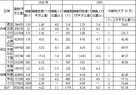 河北三省大部(京、津在内)、山东全省及江淮分水岭以北的江苏、安徽两省;长江上游区包括四川大部、甘南及黔北;云贵区包括云南、贵州两省大部分地区。 (4)沿海小计包括长江下游区城镇。 资料来源:本表根据施坚雅“城市及地方体系的等级系统”表3,以及沈汝生“中国都市之分布”中的中国5万人口以上都市表编译整理。