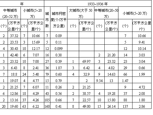 长江历来为我国主要“黄金水道”,鸦片战争后,帝国主义列强不但强迫我国开放沿海大量海港,而且也深入沿江地带,开辟通商口岸,逐步形成为一条与沿海并驾齐驱的城市发展轴。 正是由于这类通商口岸成为帝国主义倾销商品、掠夺资源的据点,自然导致了沿江各港口腹地的重新划分,遂使重庆成为川、滇、黔西南地区物资集散中心;武汉成为华中地区农副产品集中转口港;上海、南京则成为长江三角洲乃至整个长江流域的对外贸易港。从而改变了历时数千年的“扬一益二”沿江城镇分布的地域空间结构,形成了以上海——南京、武汉和重庆为核心的三大城市群集区。据统计,在这一时期,我国沿江城市约占全国城市总数的2/5以上(41.5%),城市网密度高于沿海地区,约为全国的4倍,而且集聚了2/5的大城市(人口50万以上)和近1/2的中、小城市,成为我国当时城市发展最密集的城市轴(表6-10)。 表6-10 我国近代沿江区域城市分布状况(1933~1936年)